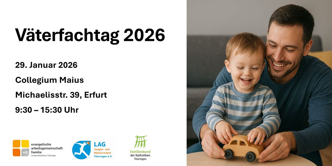 Am 29. Januar 2026 findet von 9:30 bis 15:30 Uhr der „Väterfachtag 2026“ im Collegium Maius Michaaelisstr. 39, 99084 Erfurt) unter der Überschrift „Wie Vatersein gelingen kann. Persönliche Motive und gesellschaftliche Rahmenbedingungen“ statt. Der Fachtag wird in Kooperation mit mehreren Kooperationspartnern durch die LAG Jungen- und Männerarbeit TH e. V. durchgeführt.
